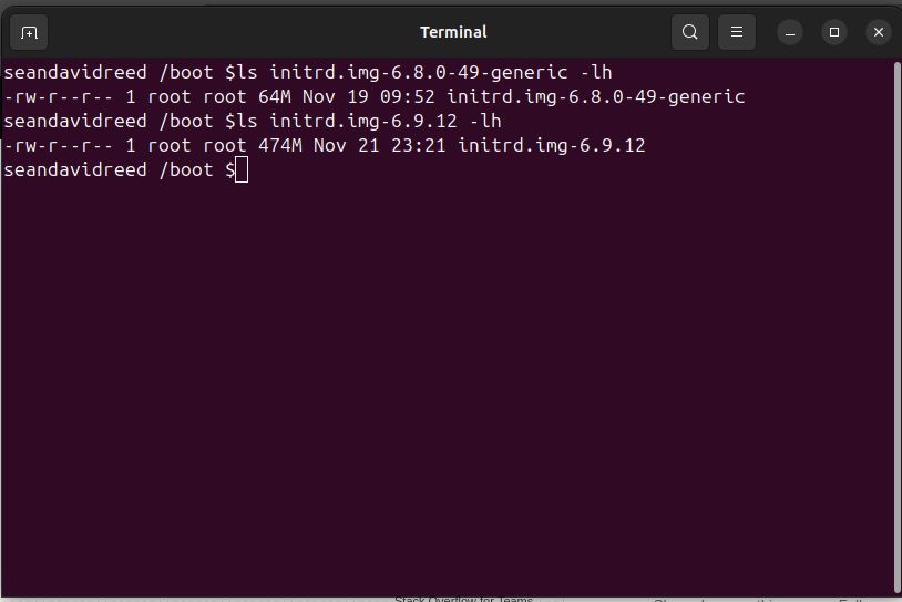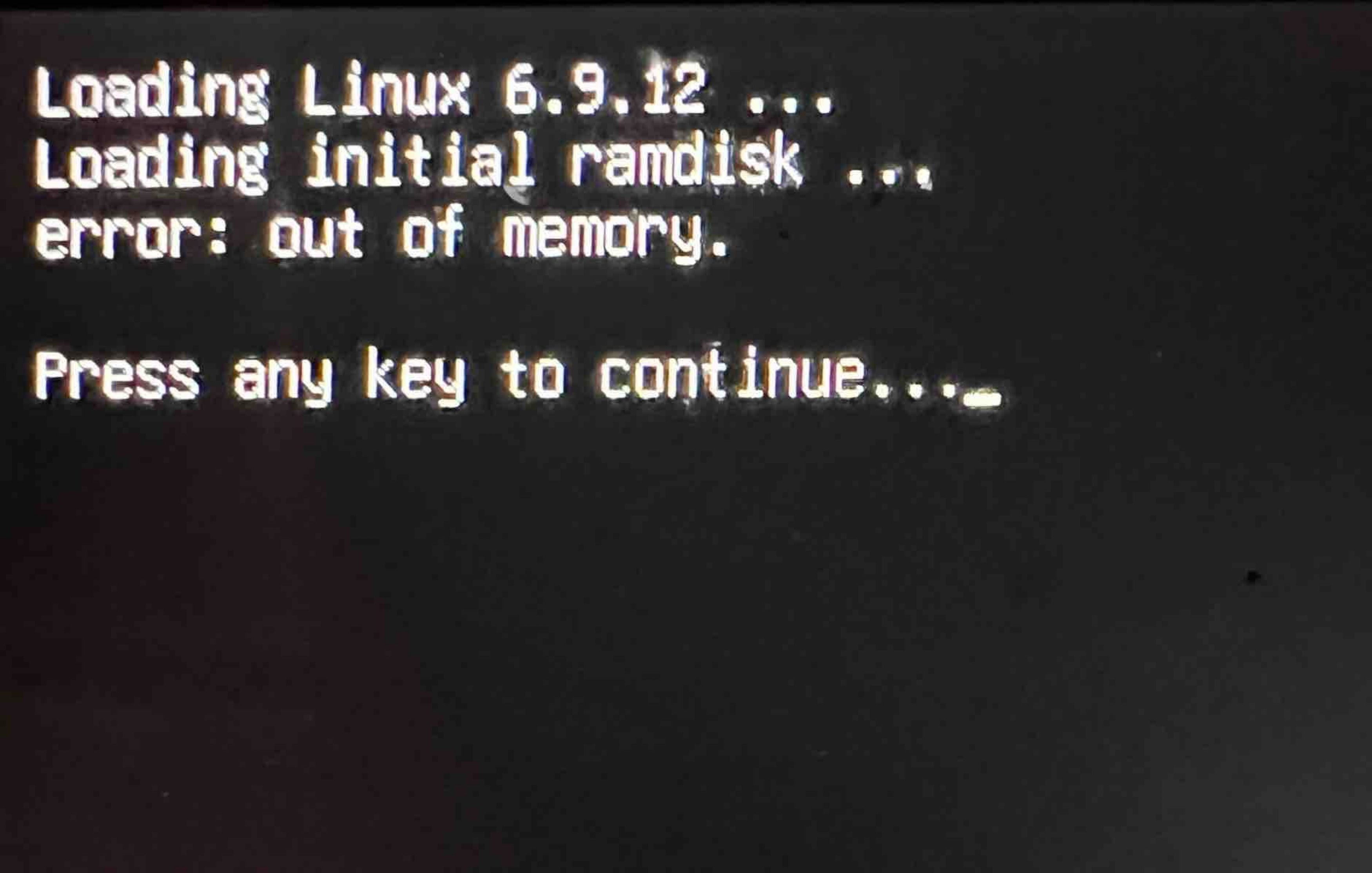 As usual, I looked for help online, and I found the issue. initrd.img-6.9.12 was way too big. I learned that initrd probably shouldn't be more than 50 MiB (Mebibytes) in size. My initrd file was almost 10 times that size. I discovered this by running the commands below.